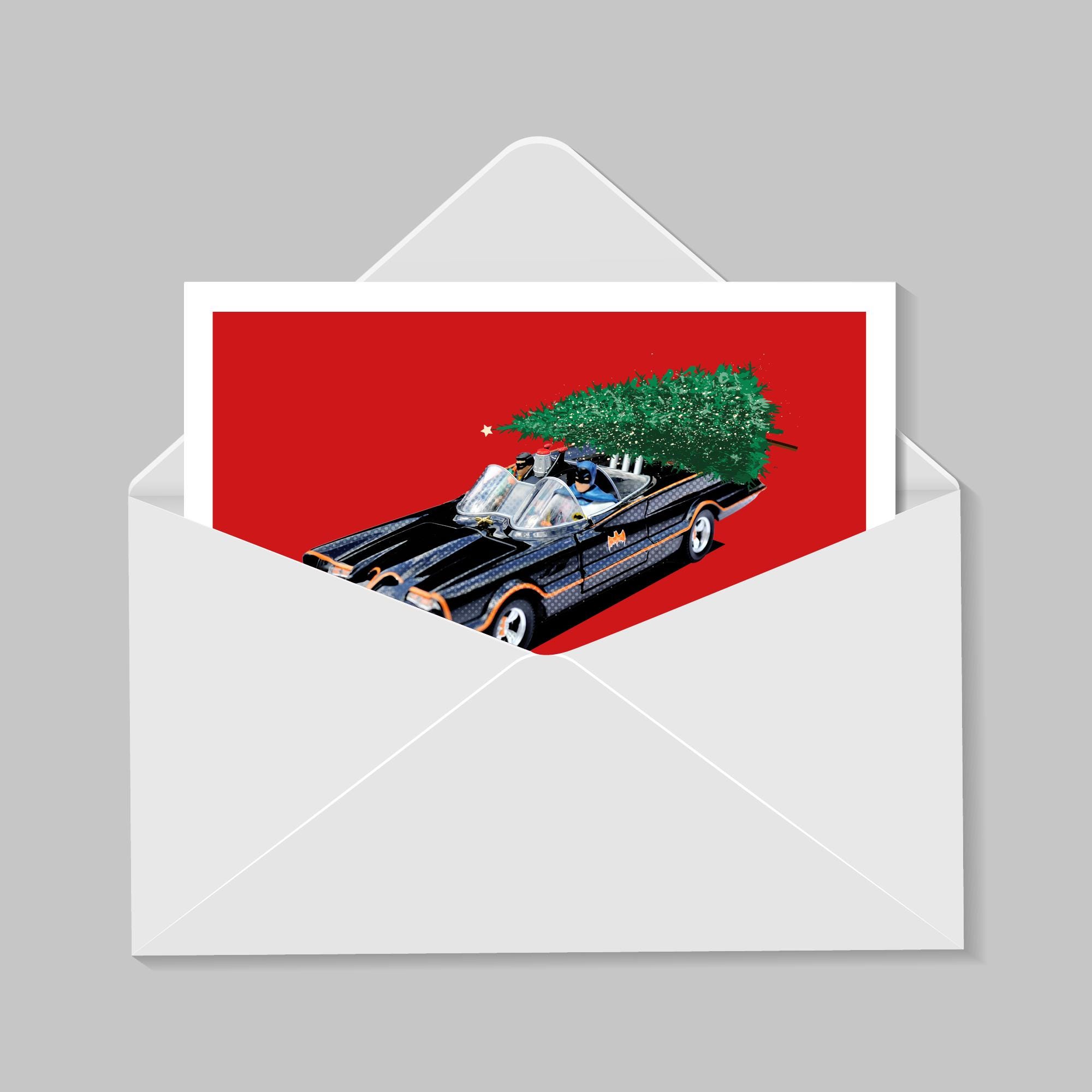Christmas-themed illustration of the iconic Batman and Robin car.