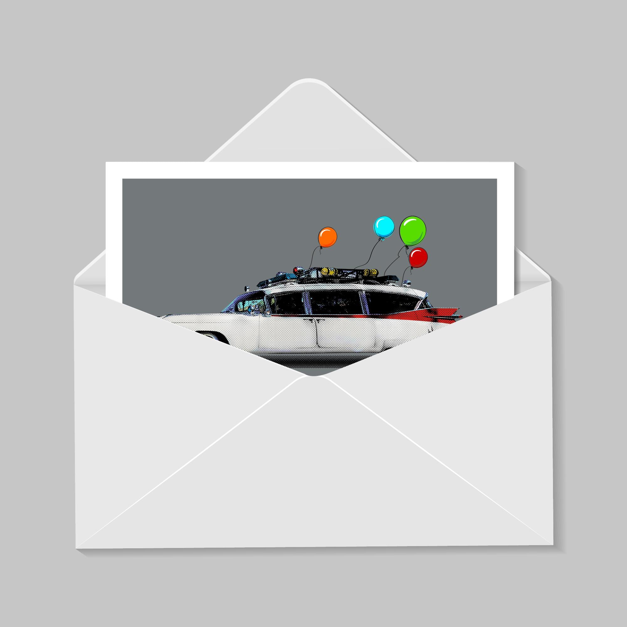 Birthday-themed illustration of Ectomobile in the film Ghostbusters.