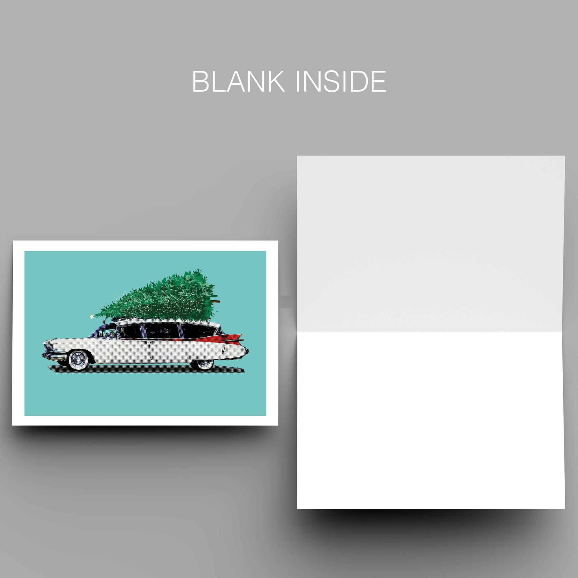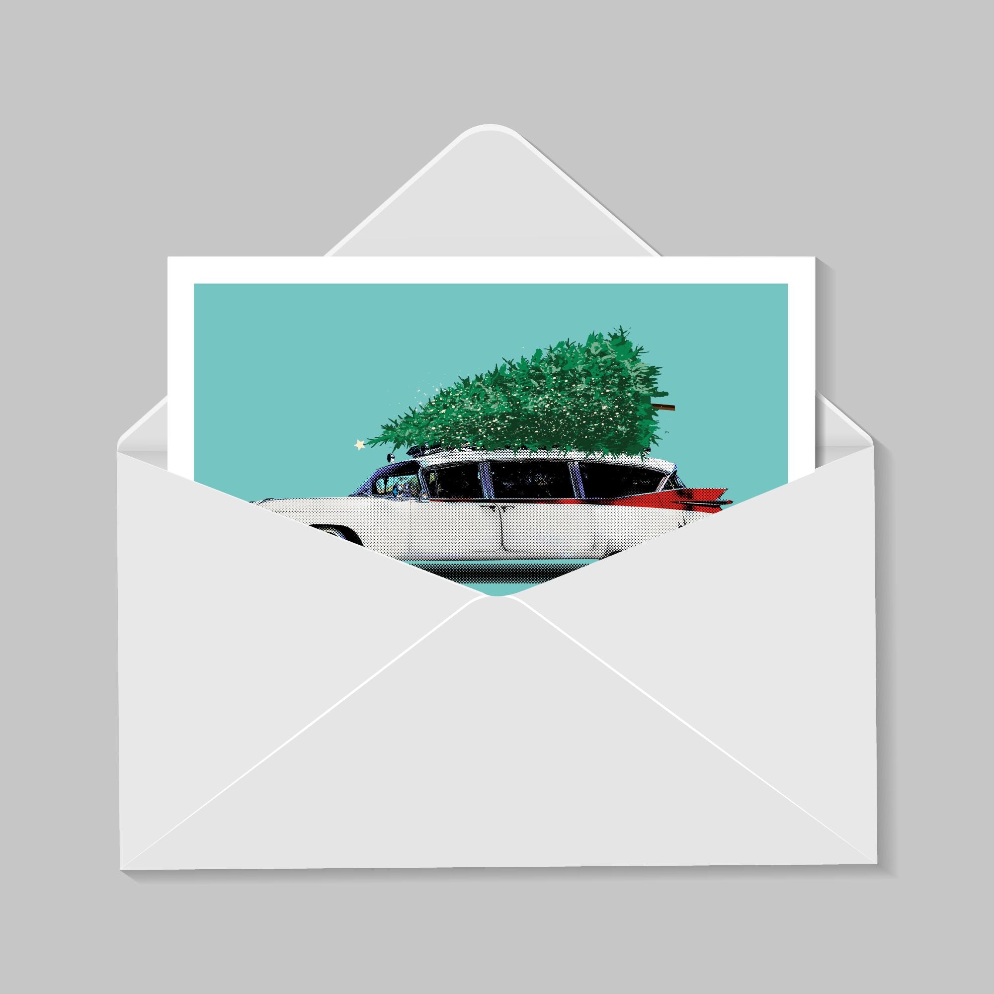 Christmas-themed illustration of Ectomobile in the film Ghostbusters.