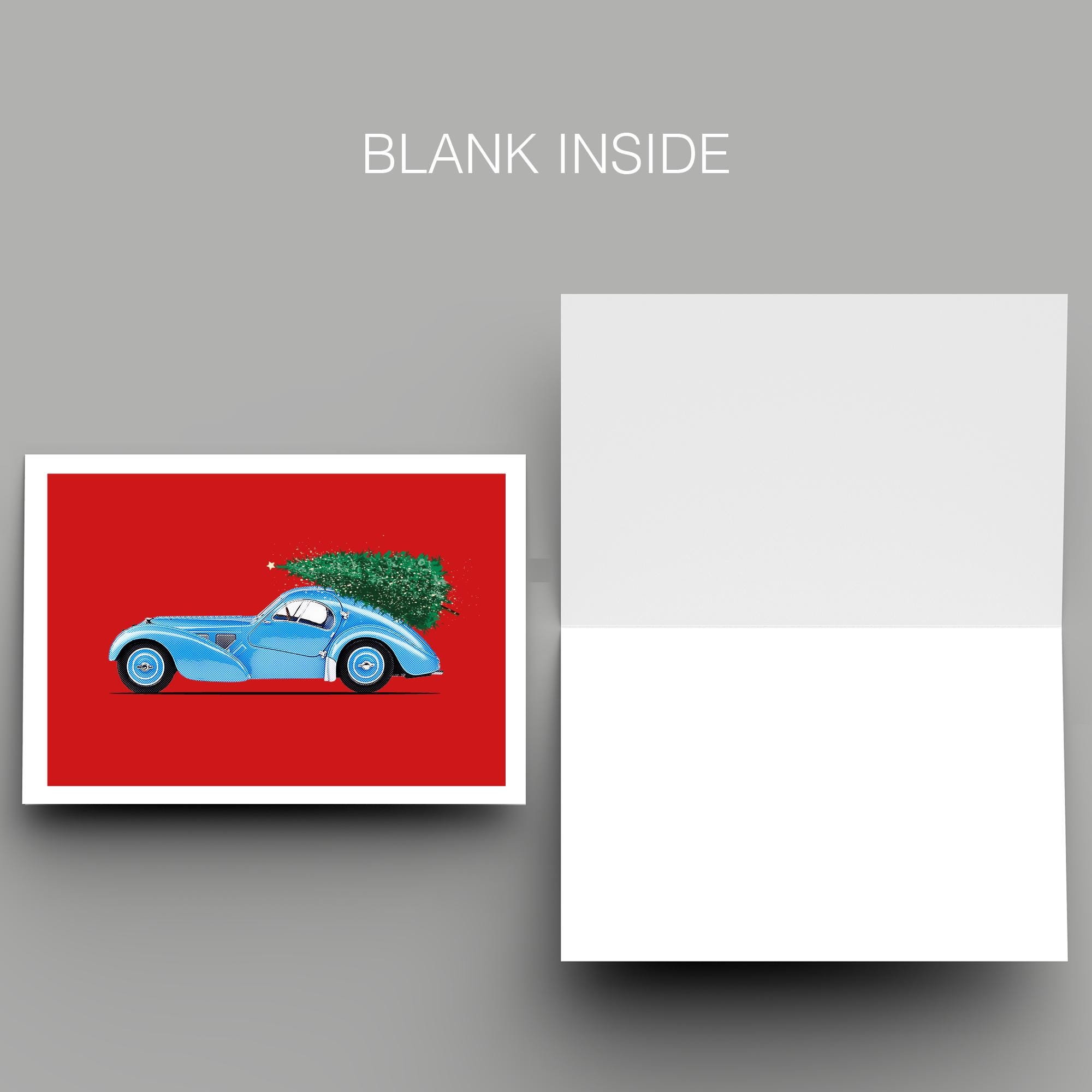Christmas-themed illustration of a Bugatti Atlantic.