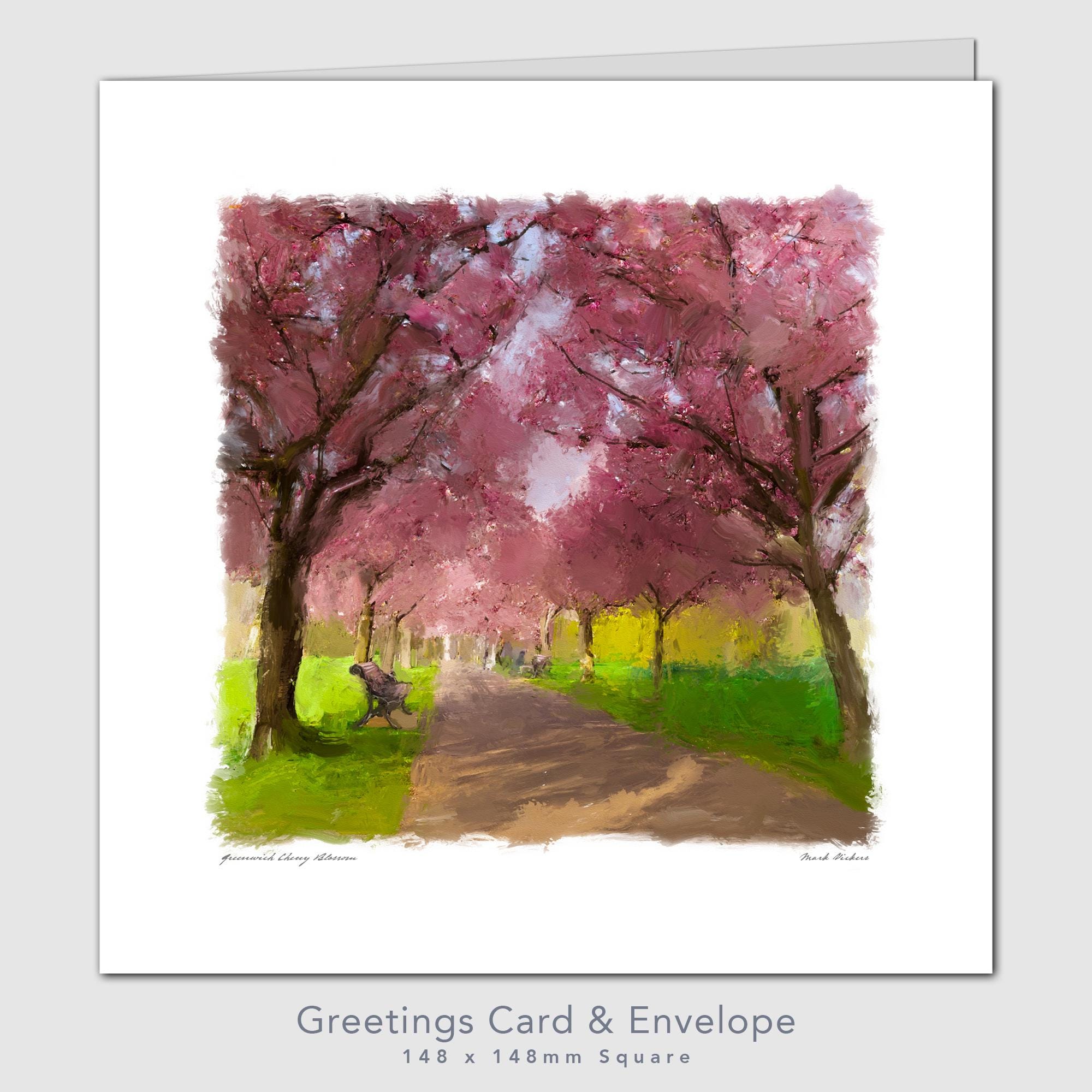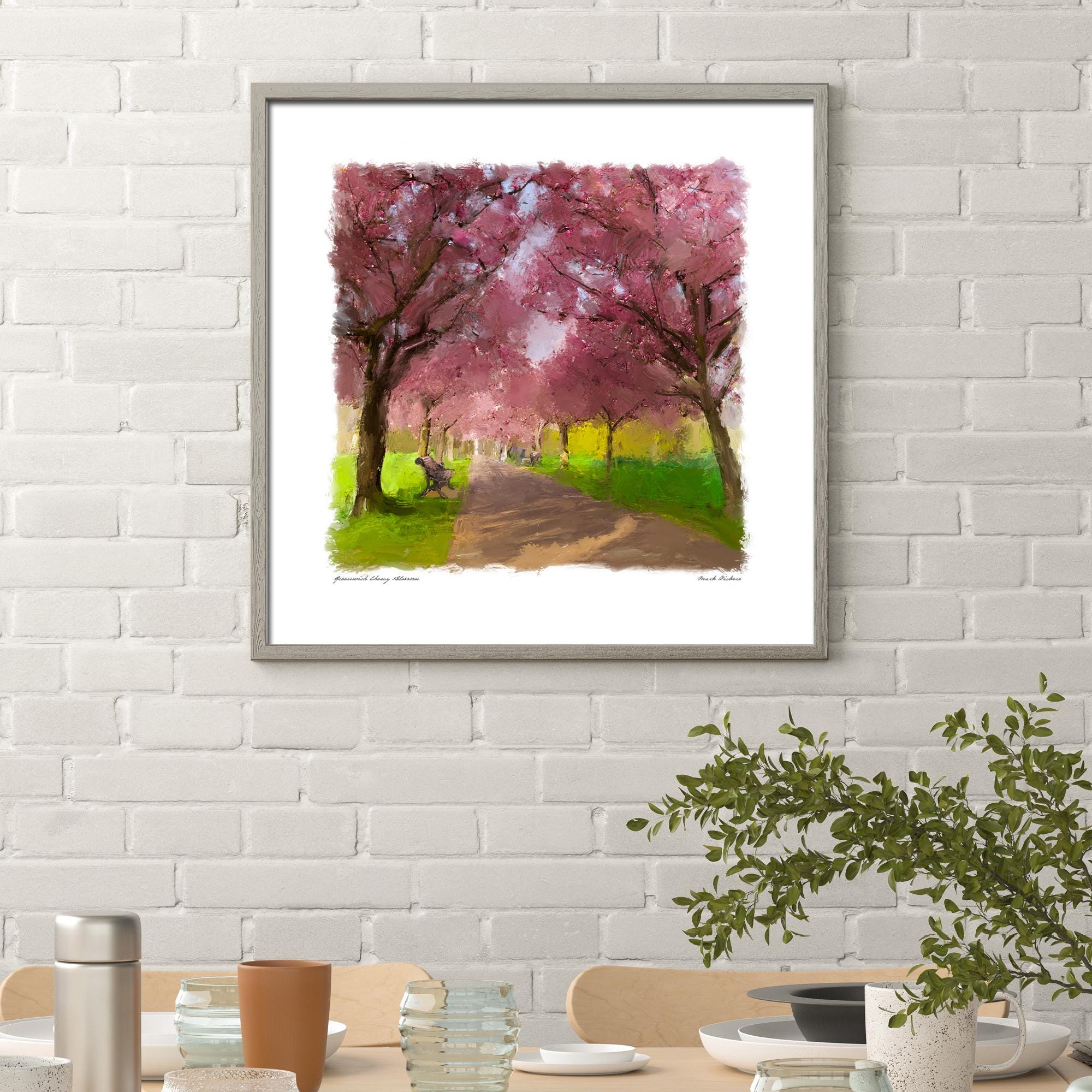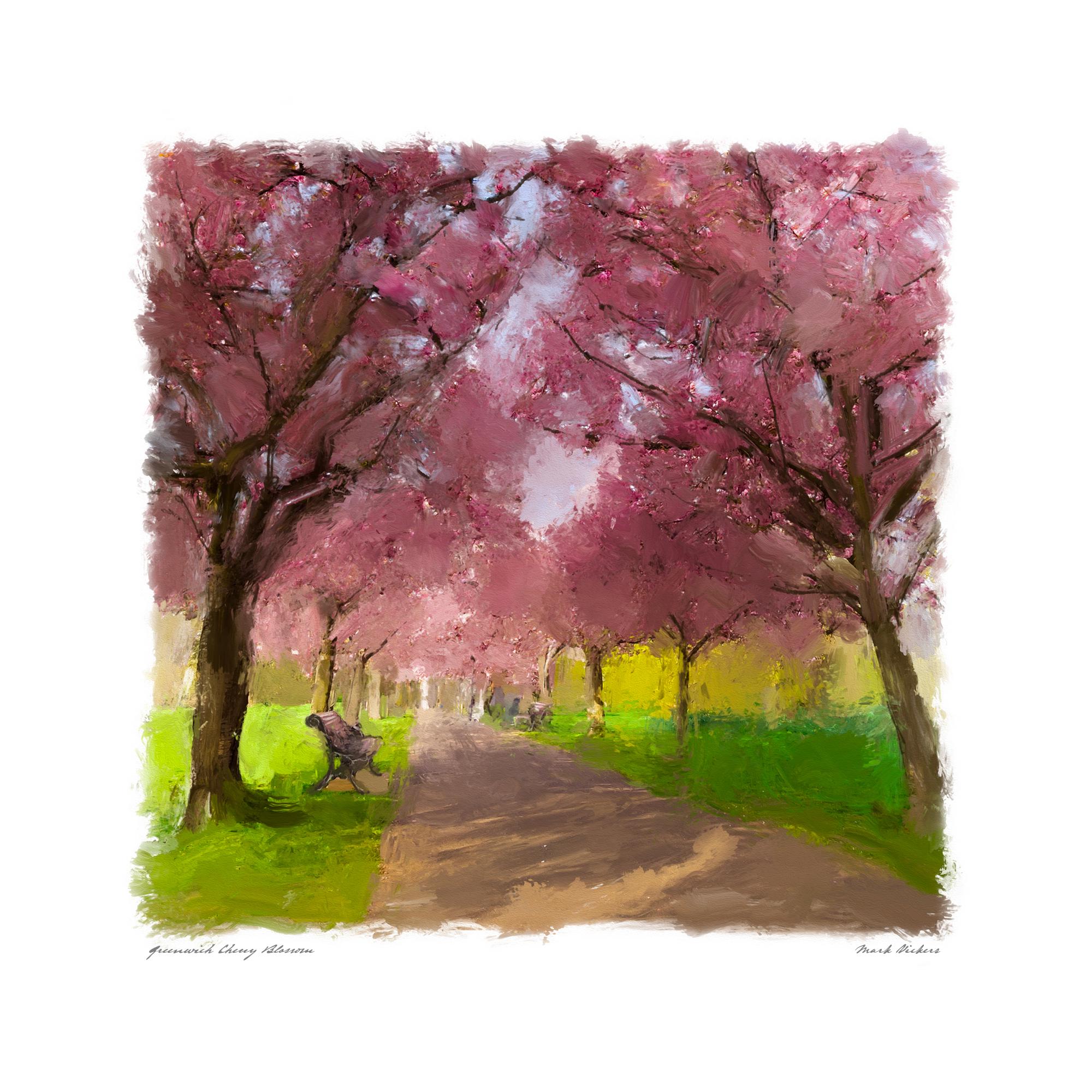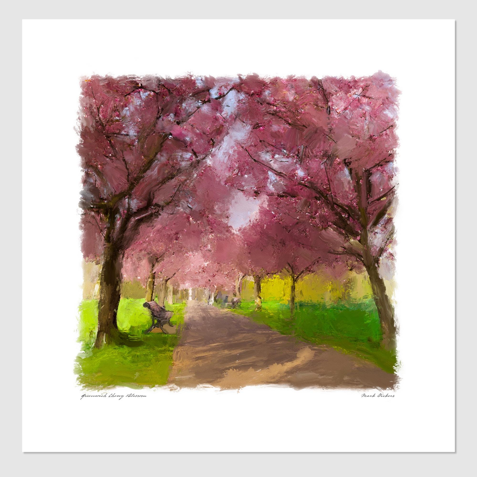 Mixed media painting of the Cherry Blossom in Greenwich Royal Park, London.