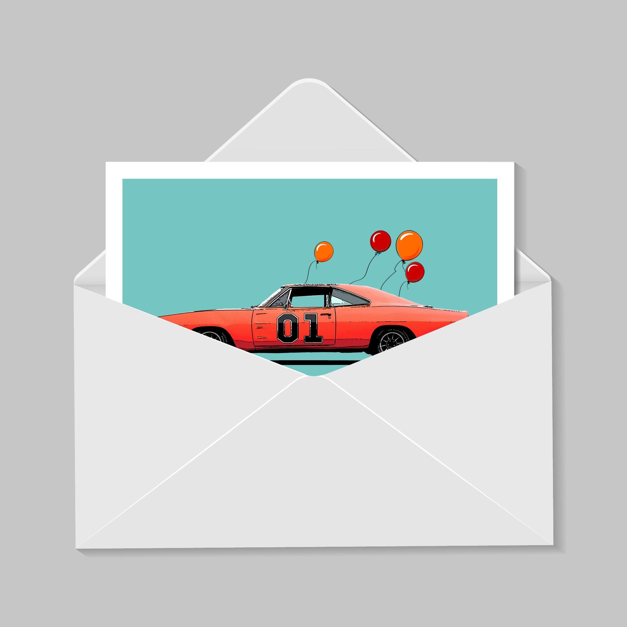 Birthday-themed illustration of the iconic Dodge Charger in The Dukes of Hazzard.