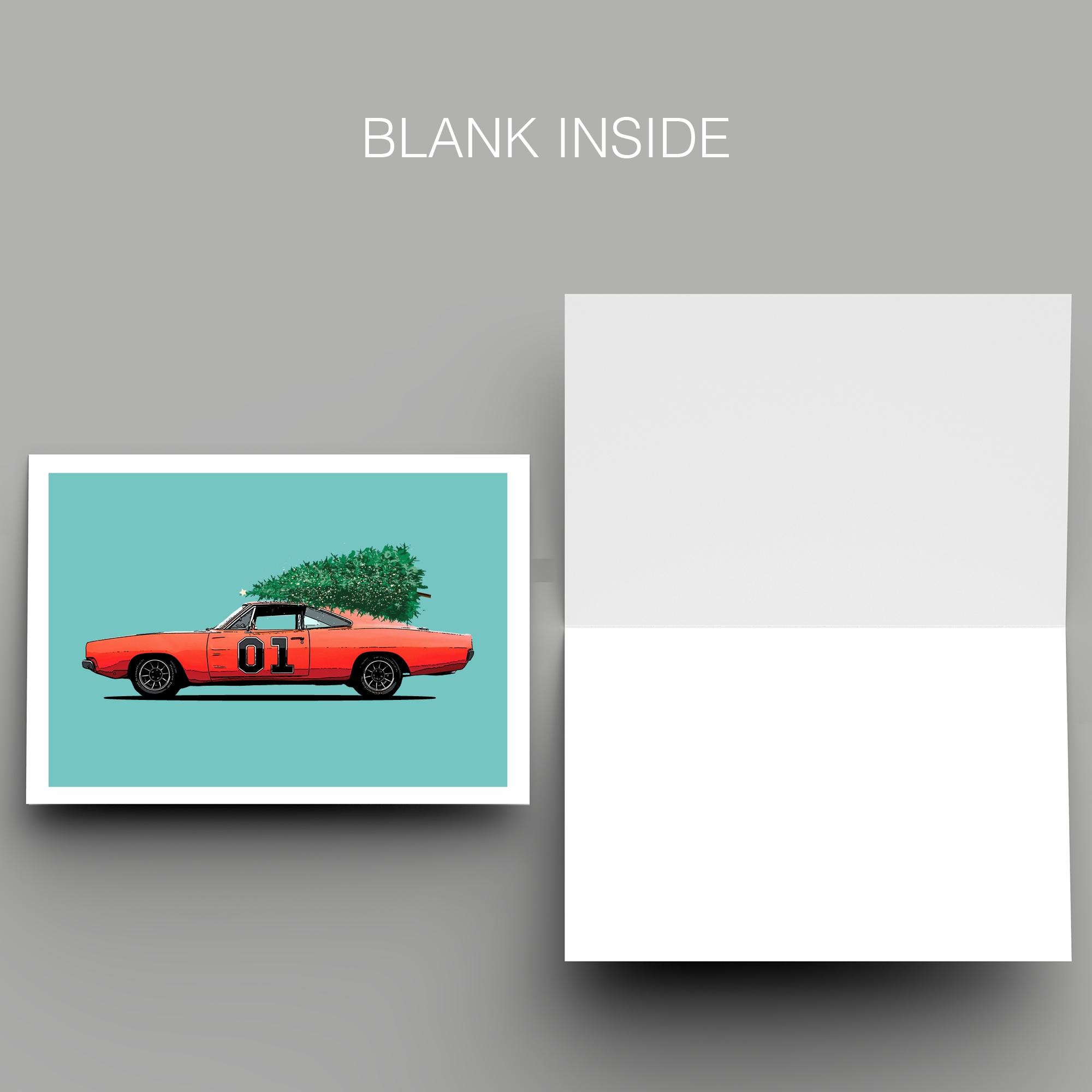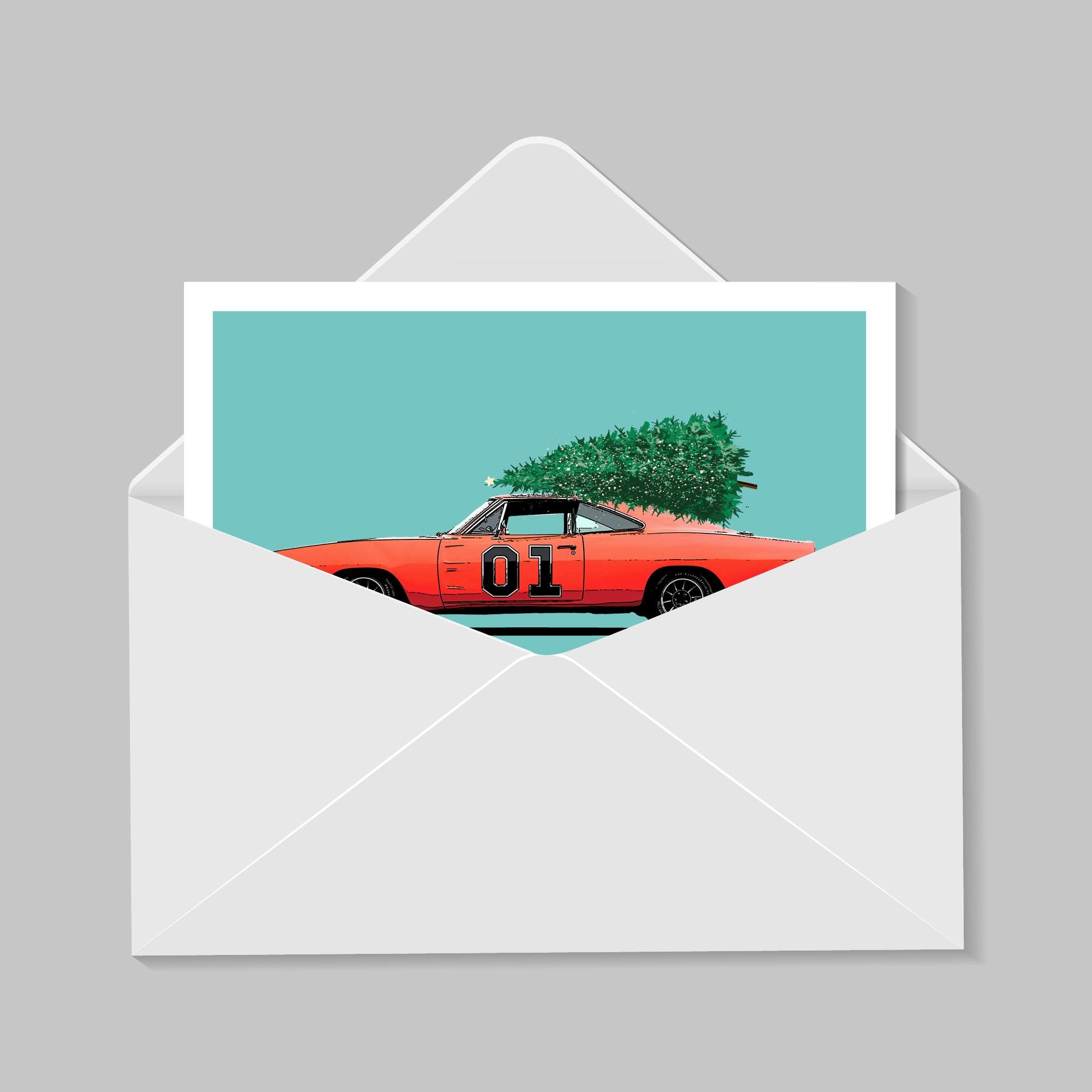 Christmas-themed illustration of the iconic Dodge Charger in The Dukes of Hazzard.