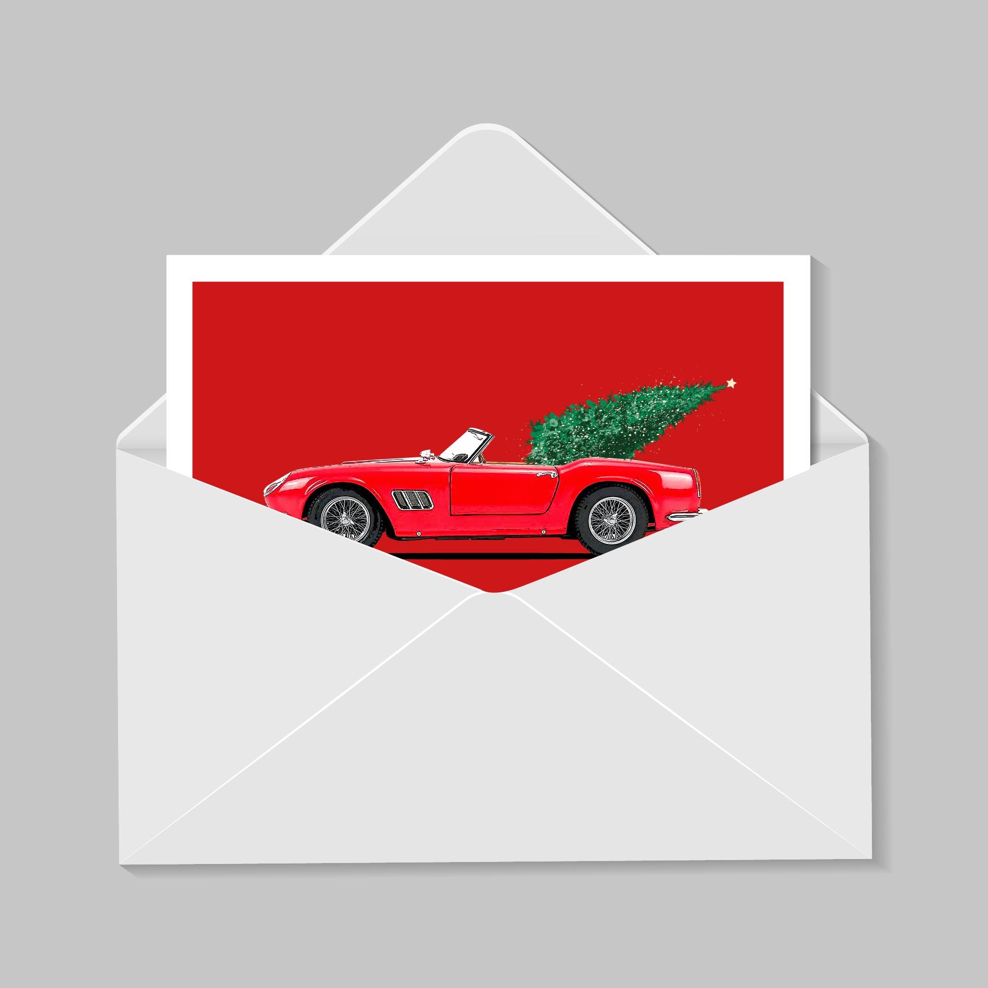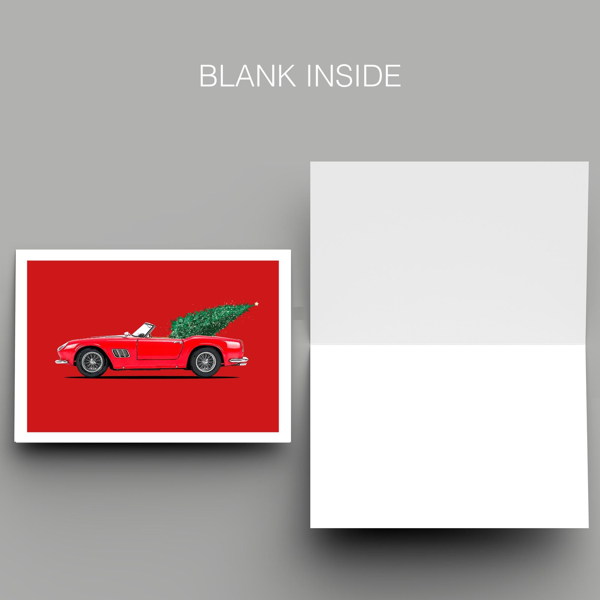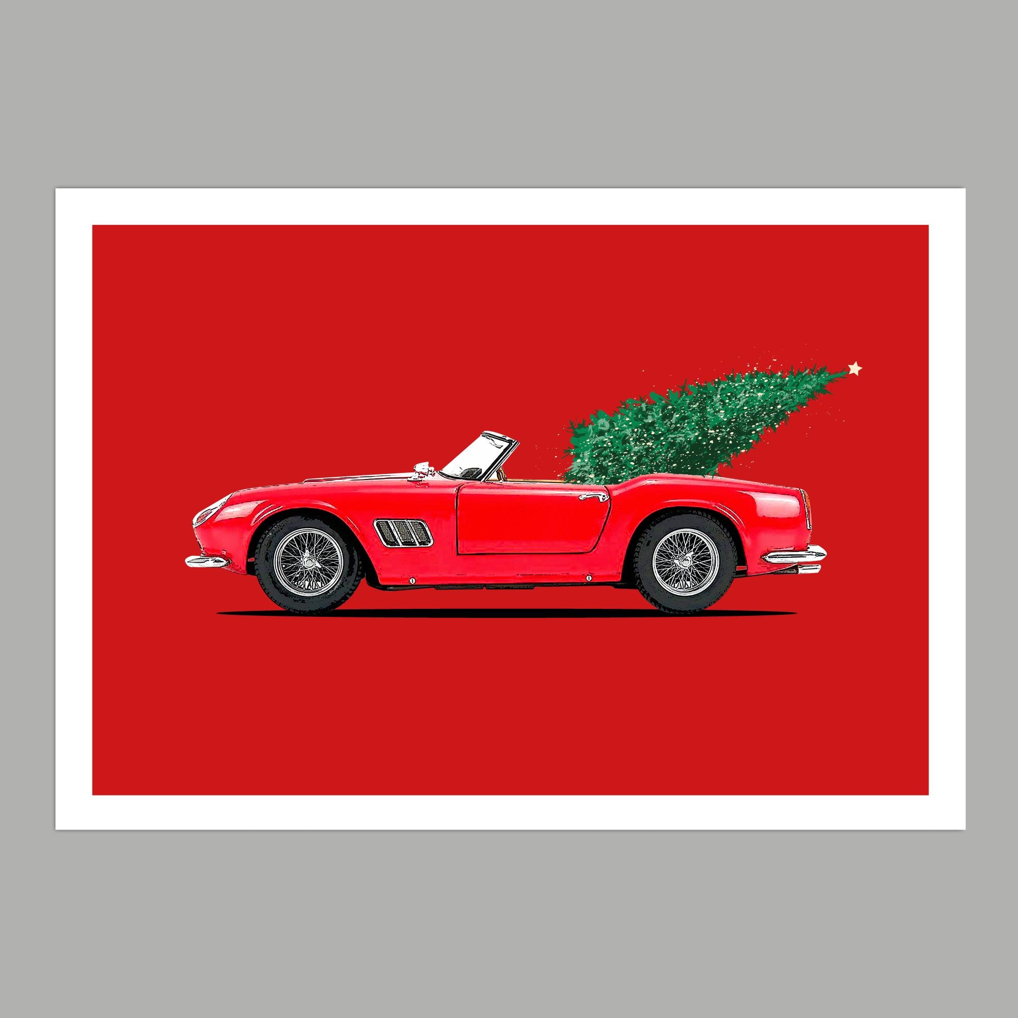 Christmas-themed illustration of the iconic Ferris Bueller's Day Off 1961 Ferrari 250 GT California Spyder.