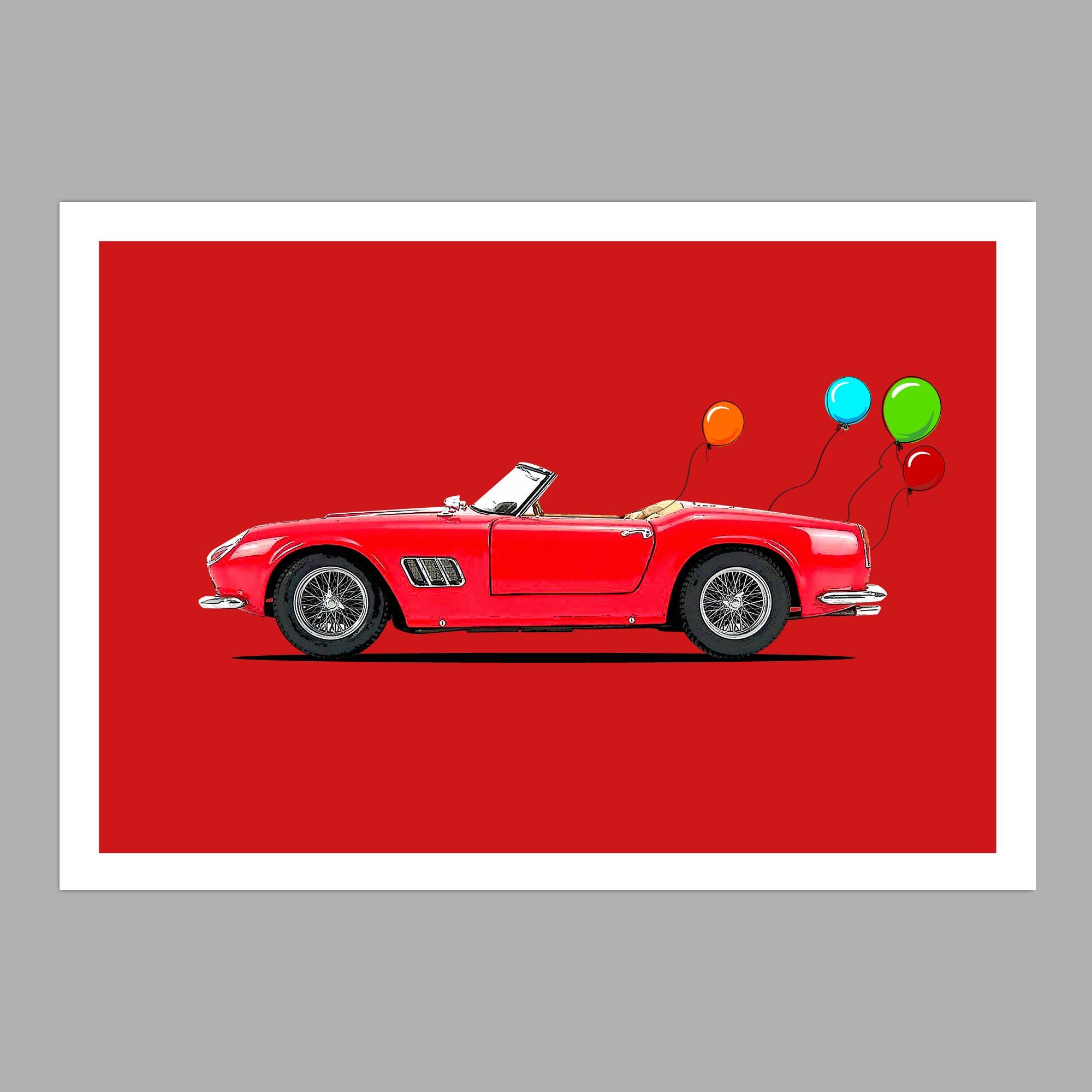 Birthday-themed illustration of the iconic Ferris Bueller's Day Off 1961 Ferrari 250 GT California Spyder.