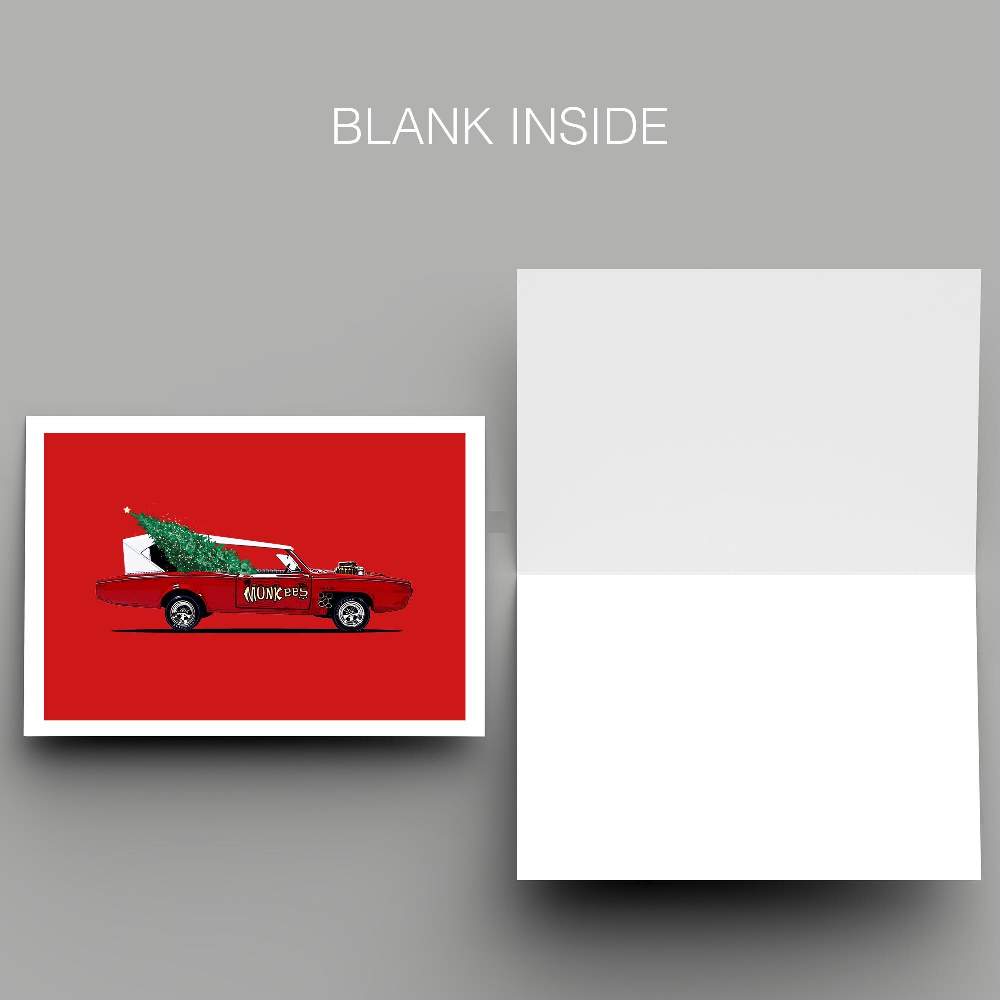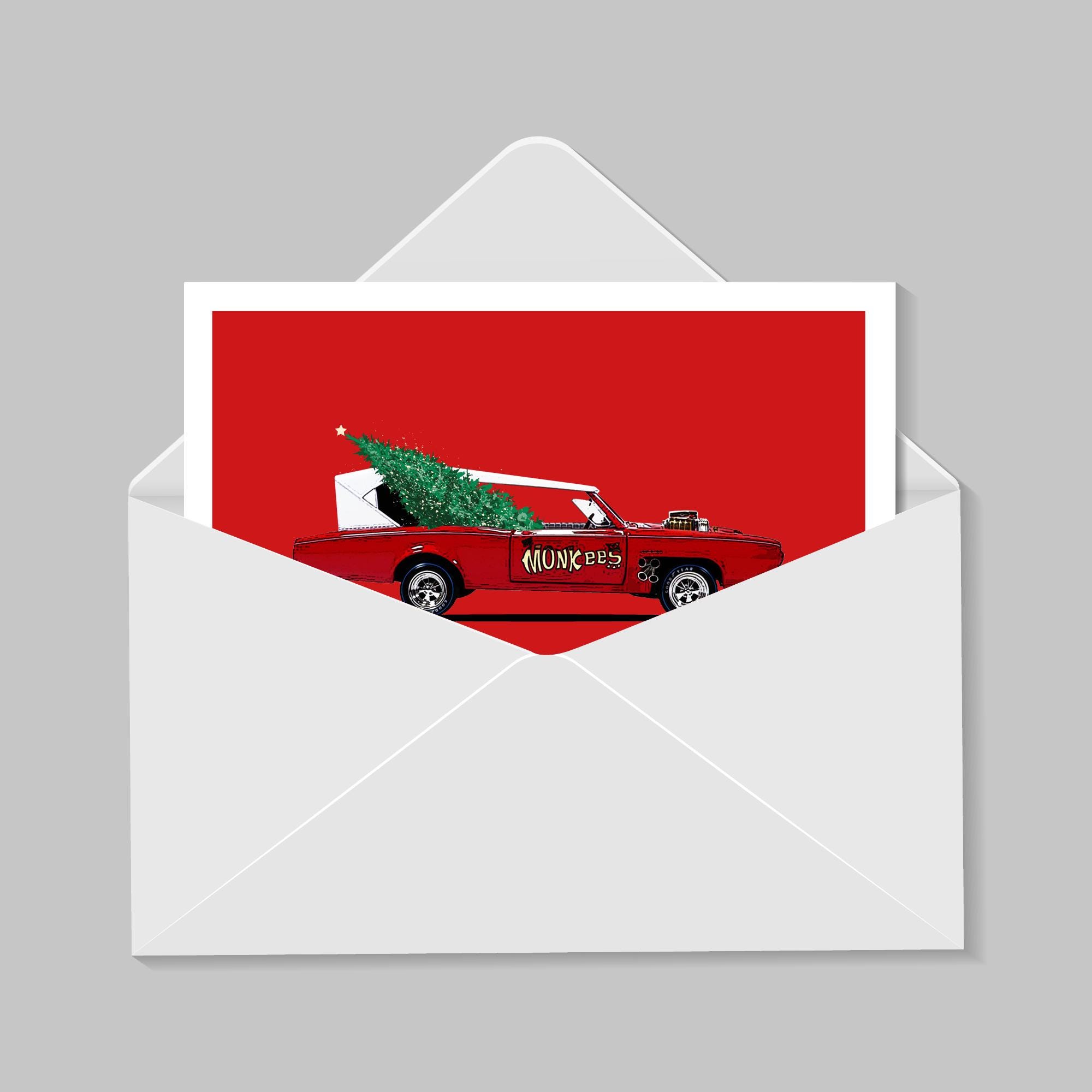 Christmas-themed illustration of the iconic Monkees Monkeemobile.