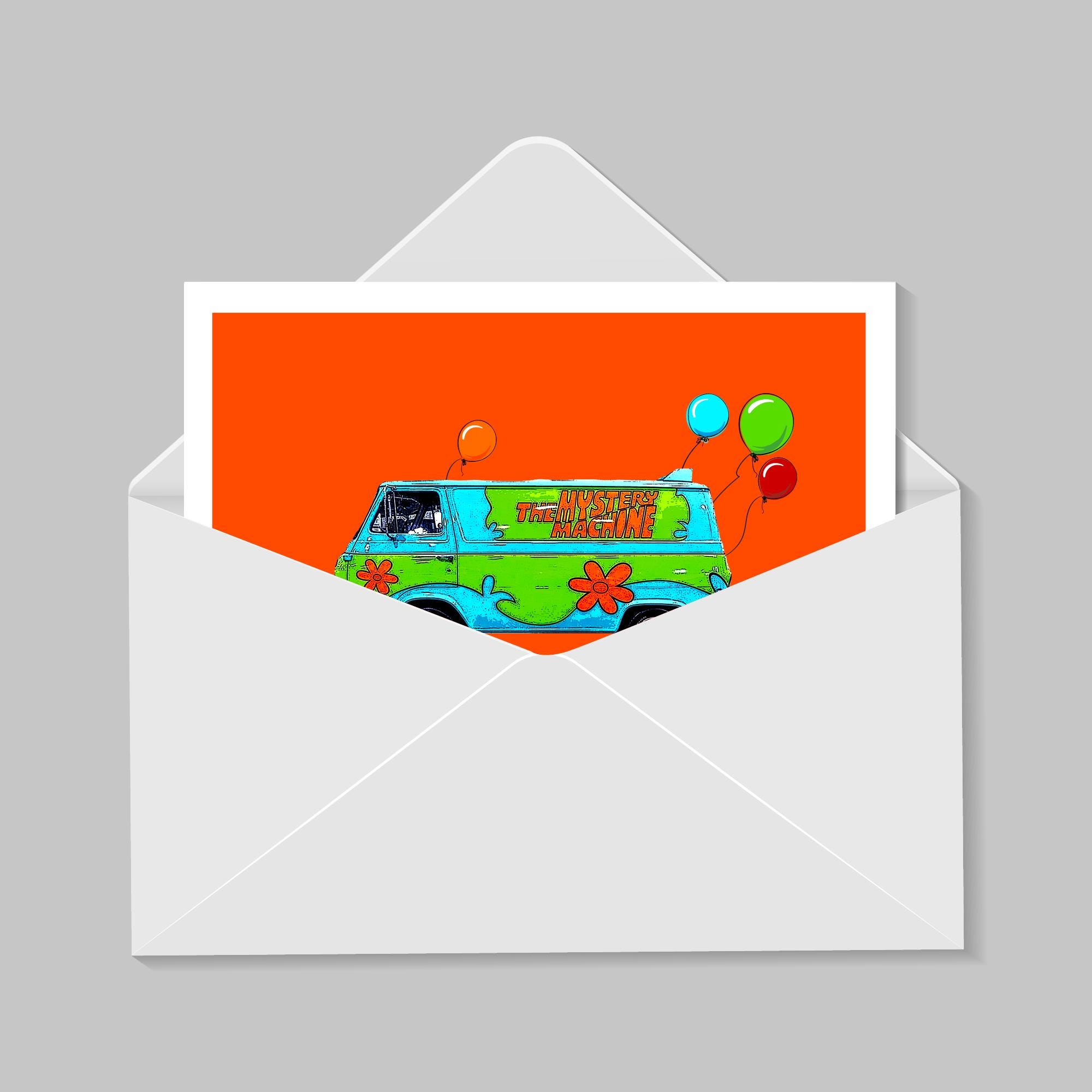 Birthday-themed illustration of the iconic Scooby-Doo's Van.