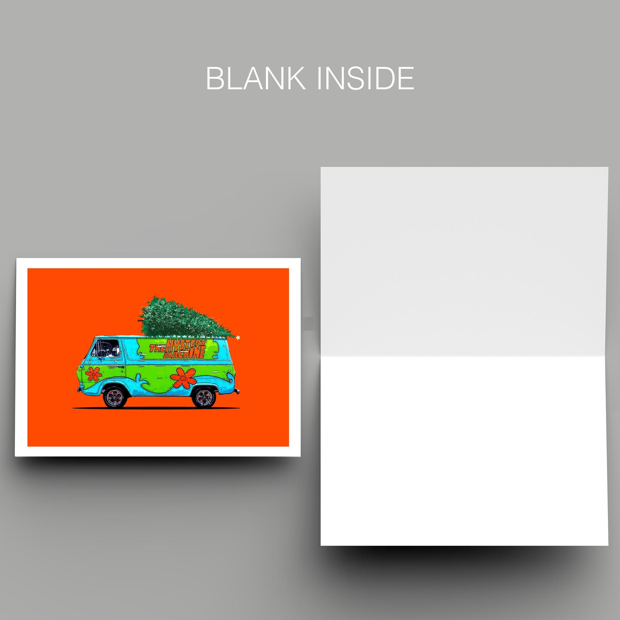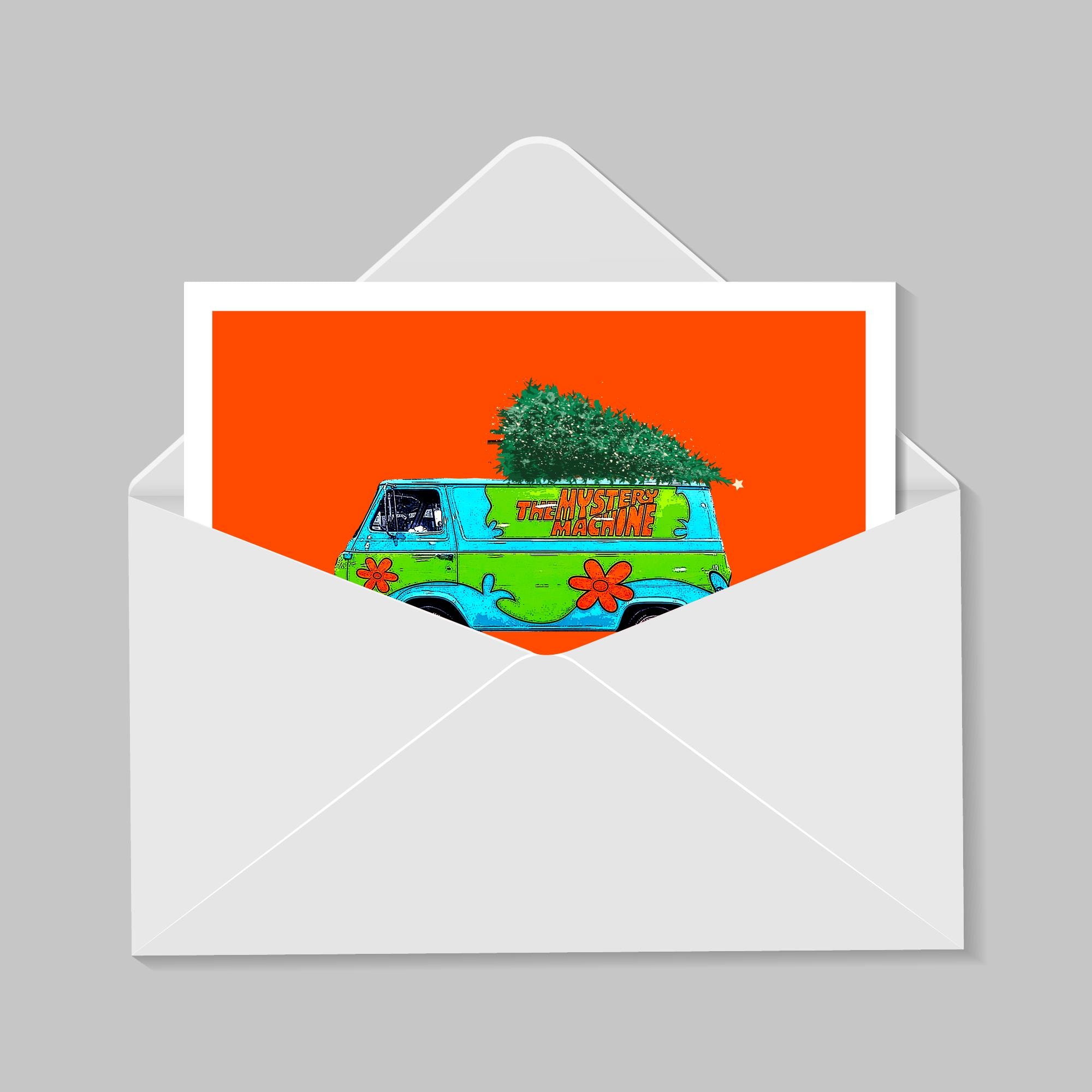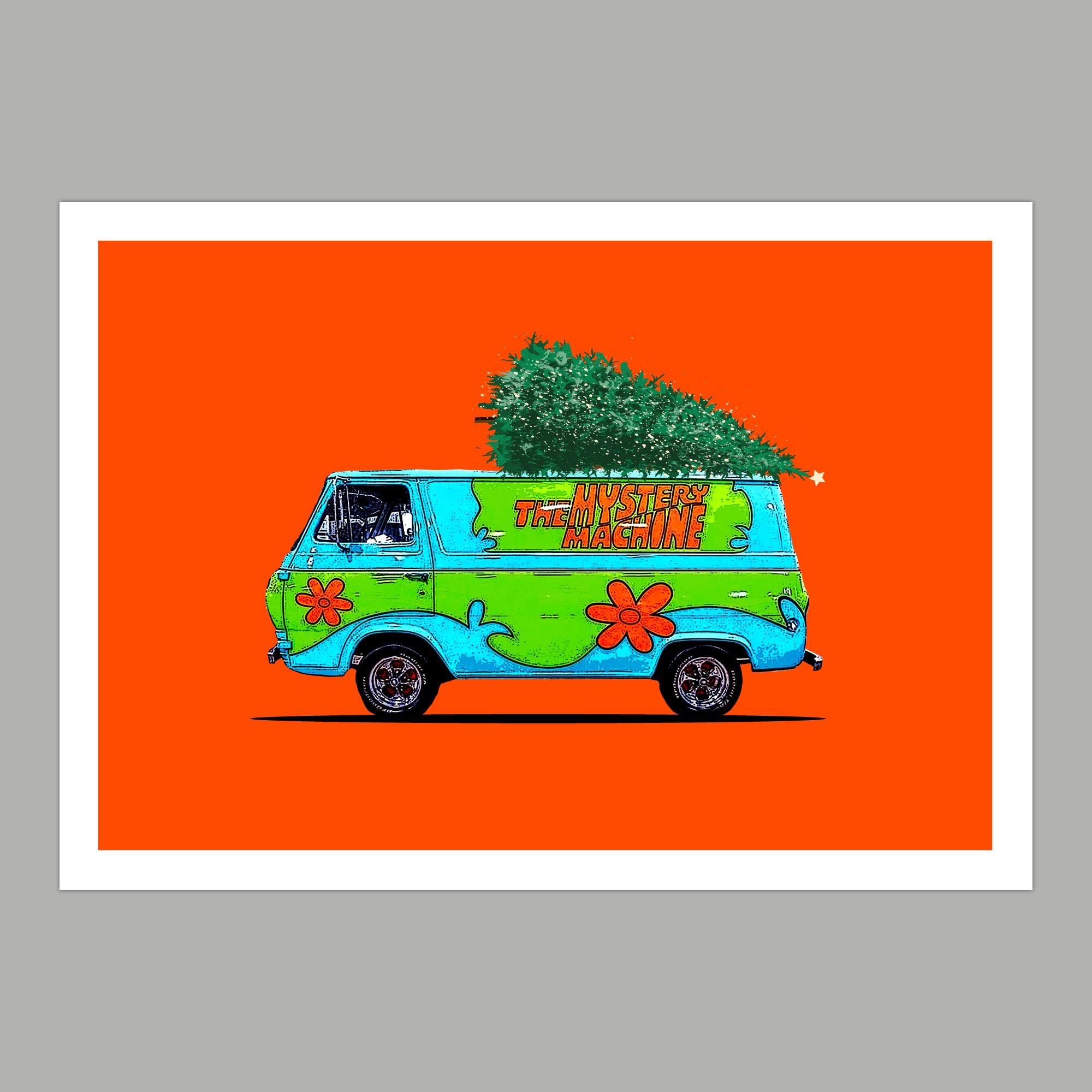 Christmas-themed illustration of the iconic Scooby-Doo's Christmas Van.
