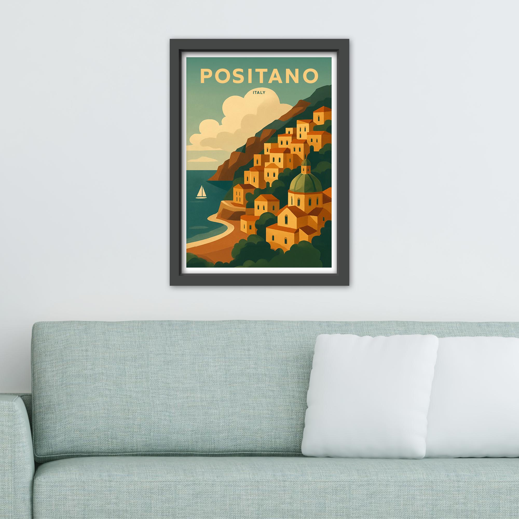A poster-style illustration of the town of Positano, Amalfi Coast Italy.
