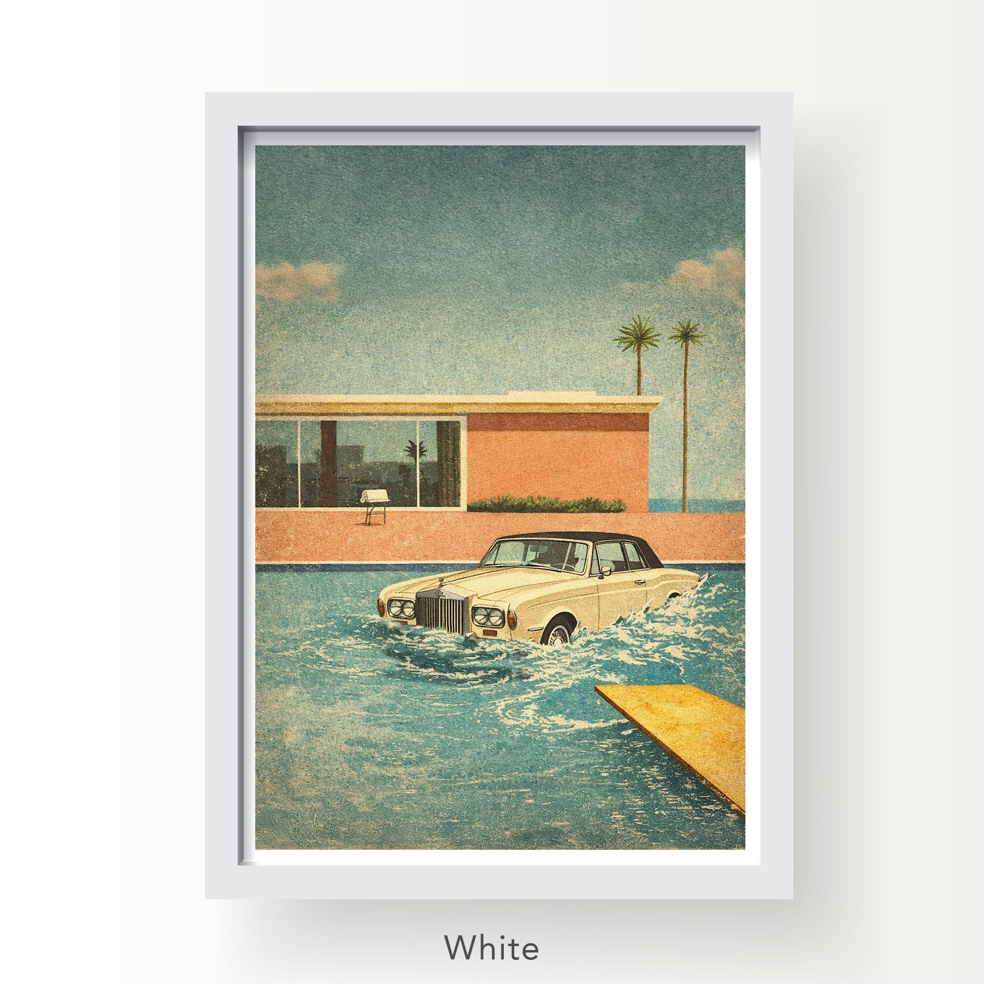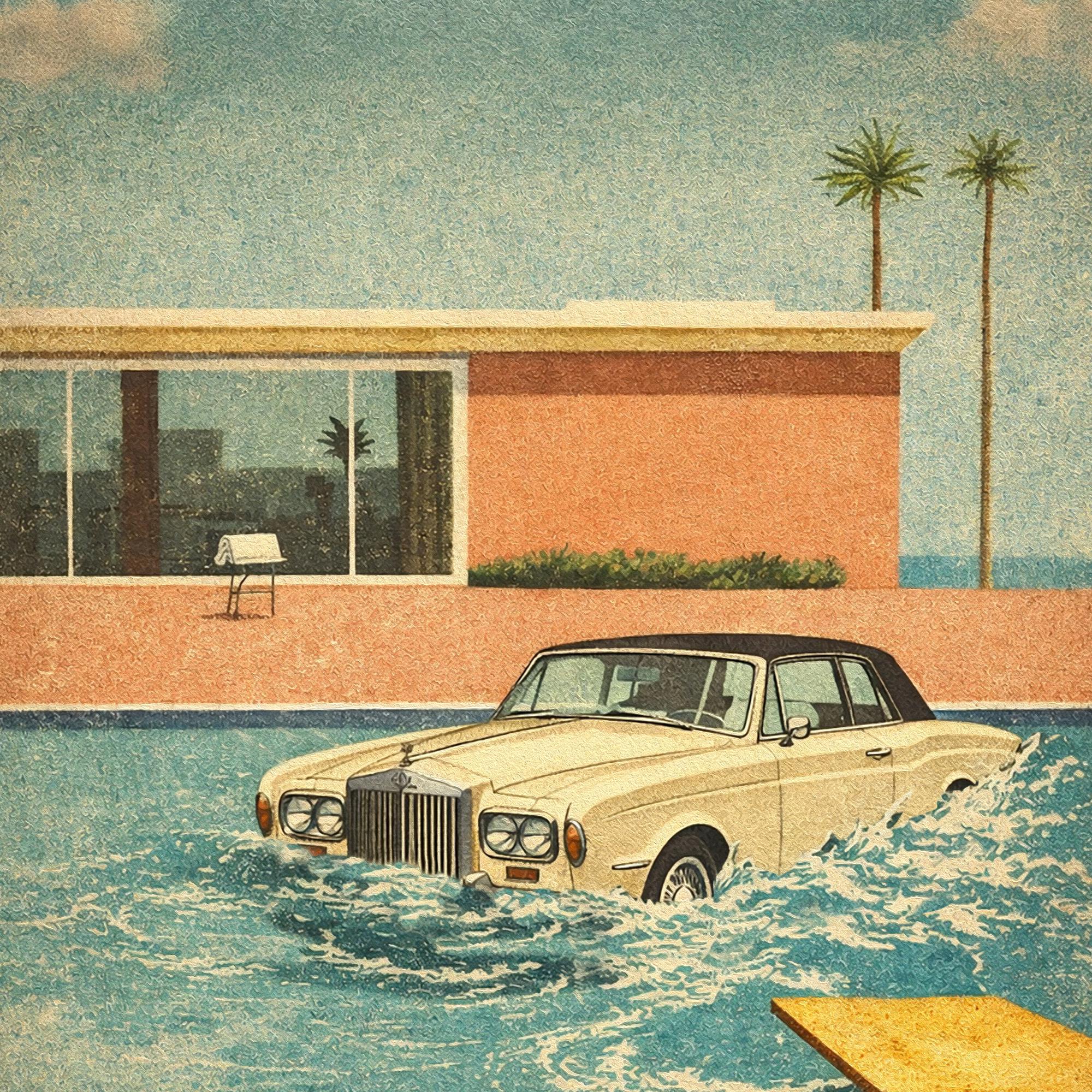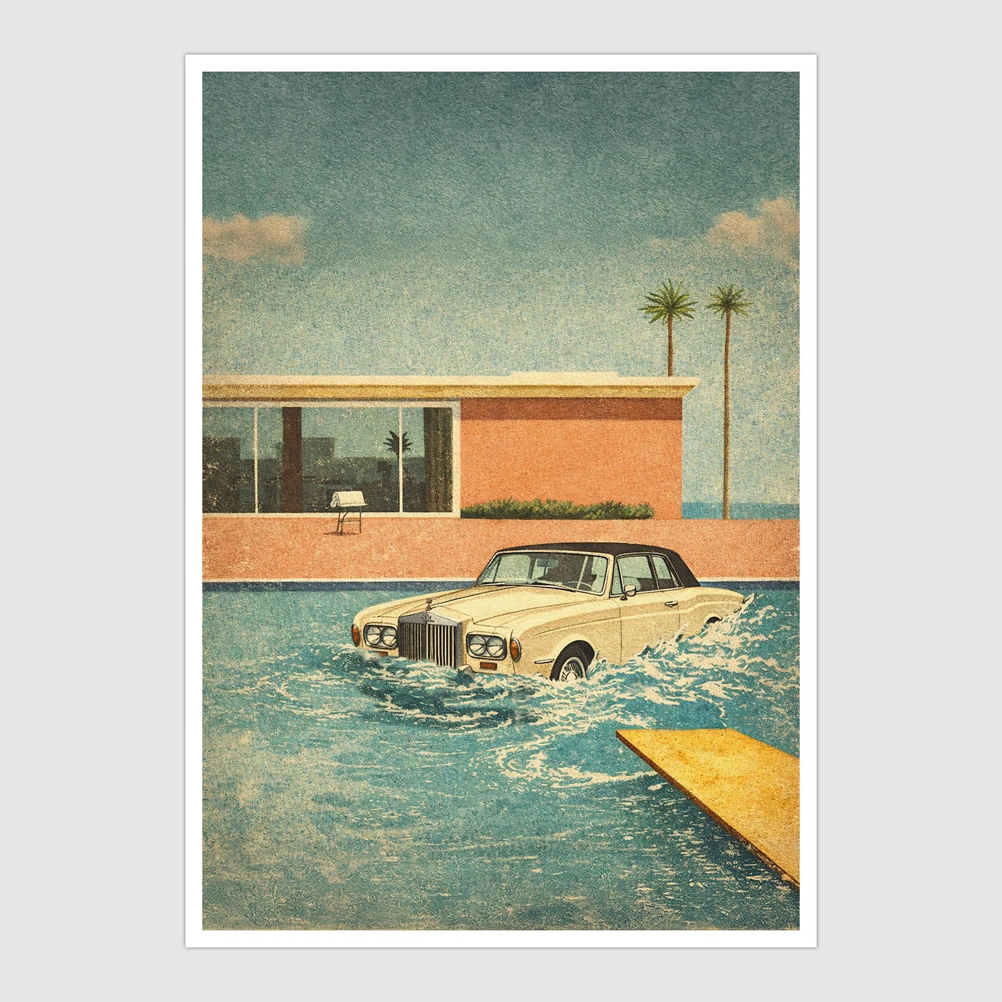 Poster Design of the Keith Moon Legend of the Rolls Royce in the Pool merged with the iconic David Hockney swimming pool painting style.