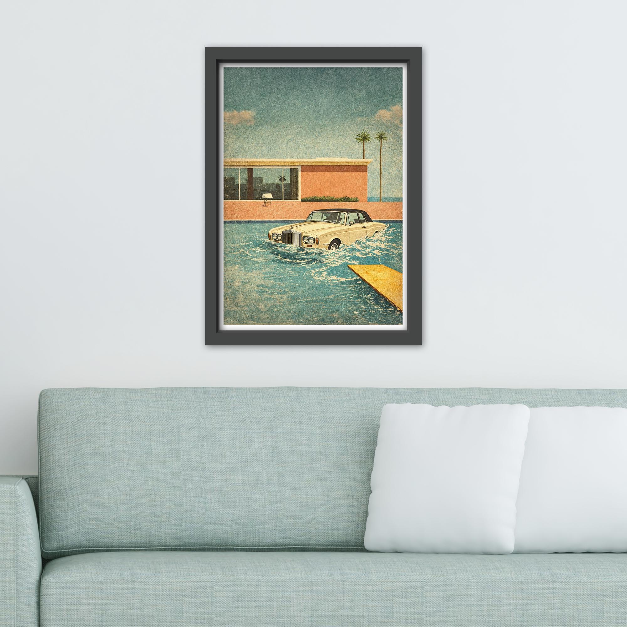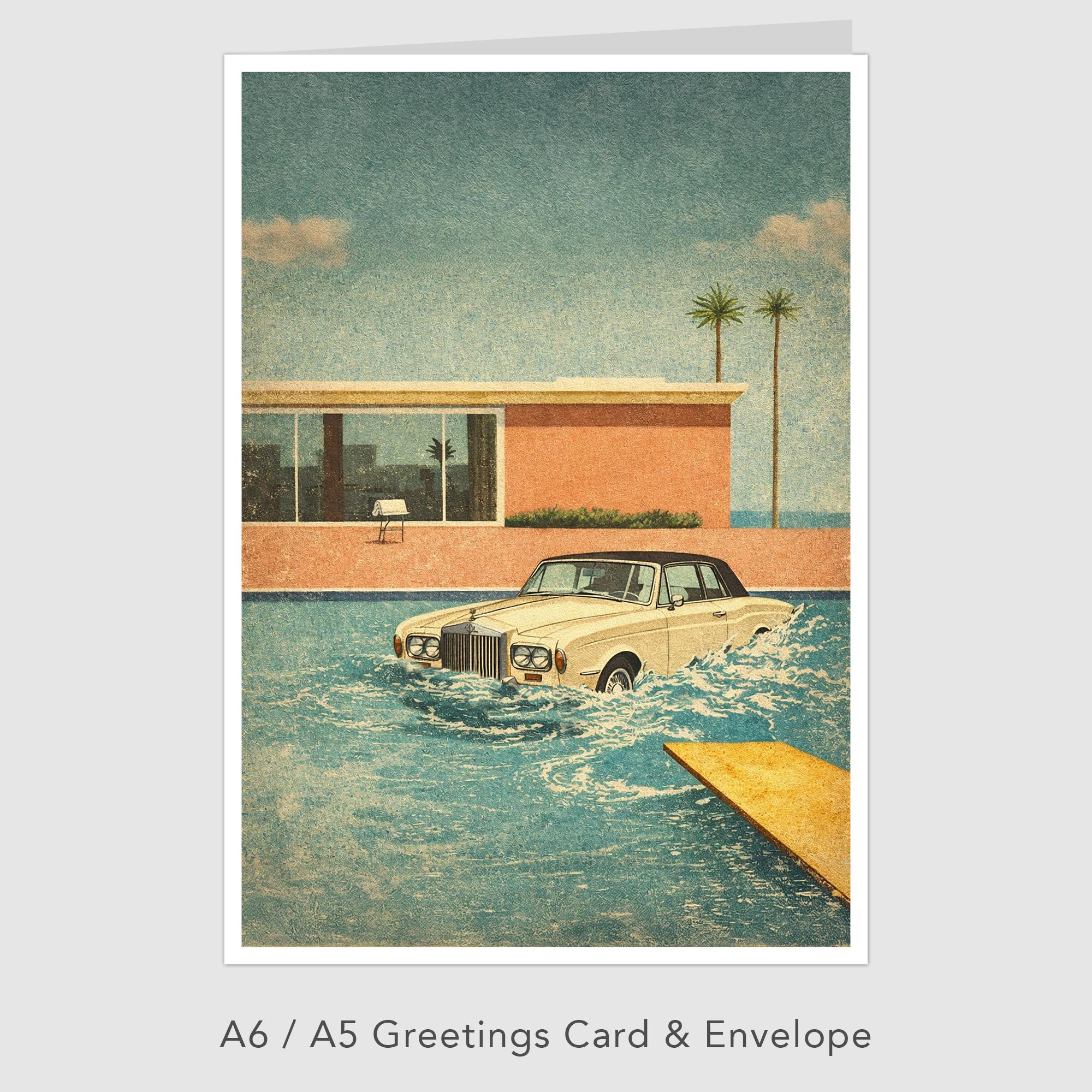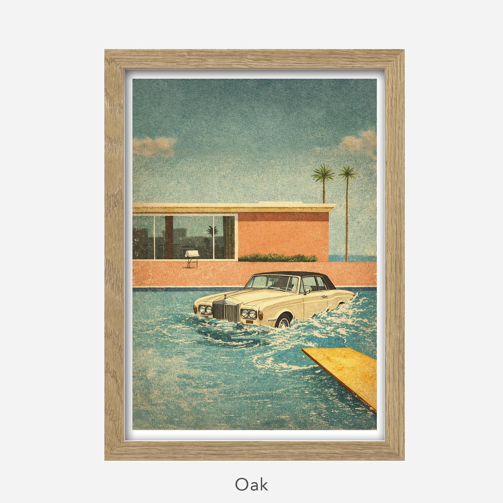 Poster Design of the Keith Moon Legend of the Rolls Royce in the Pool merged with the iconic David Hockney swimming pool painting style.