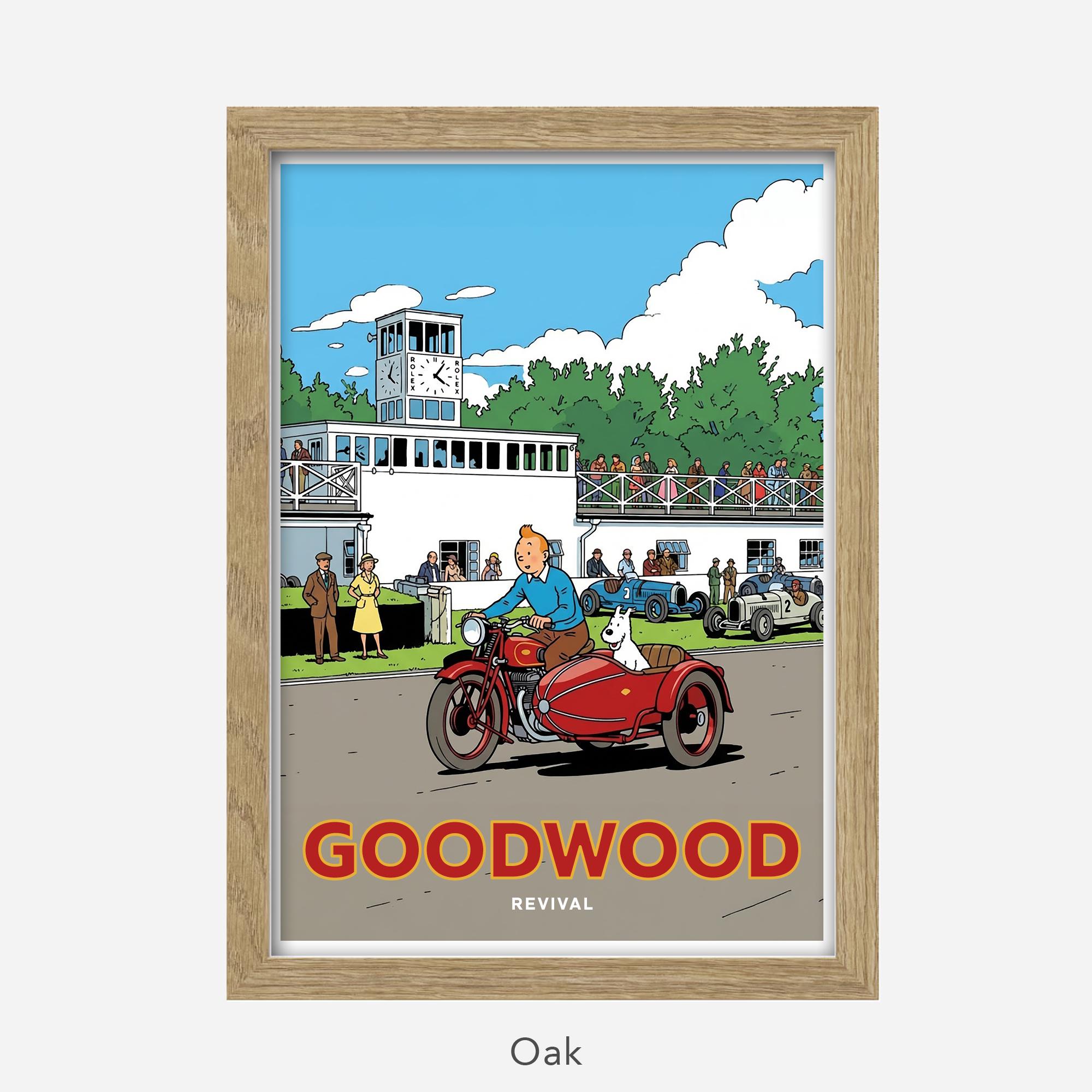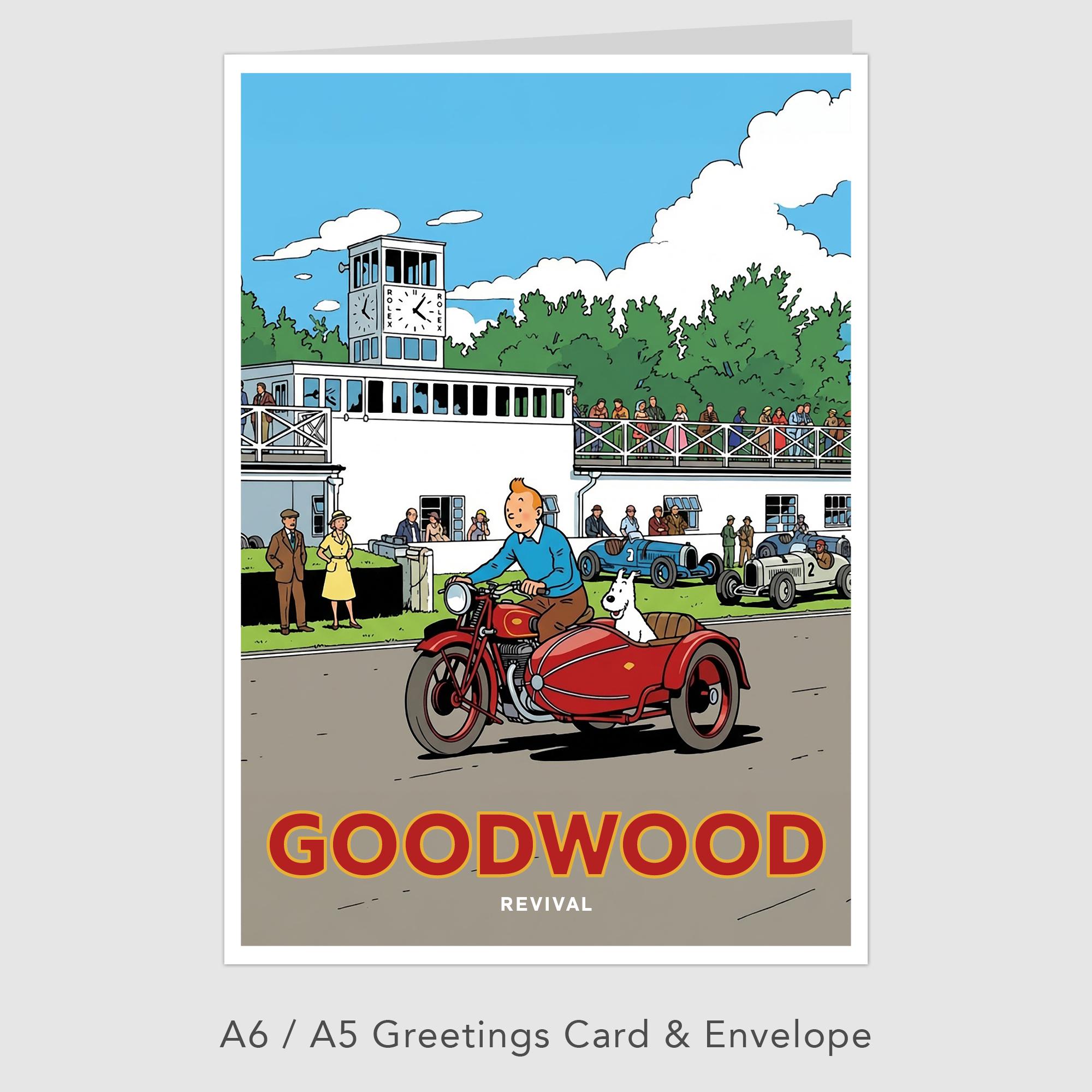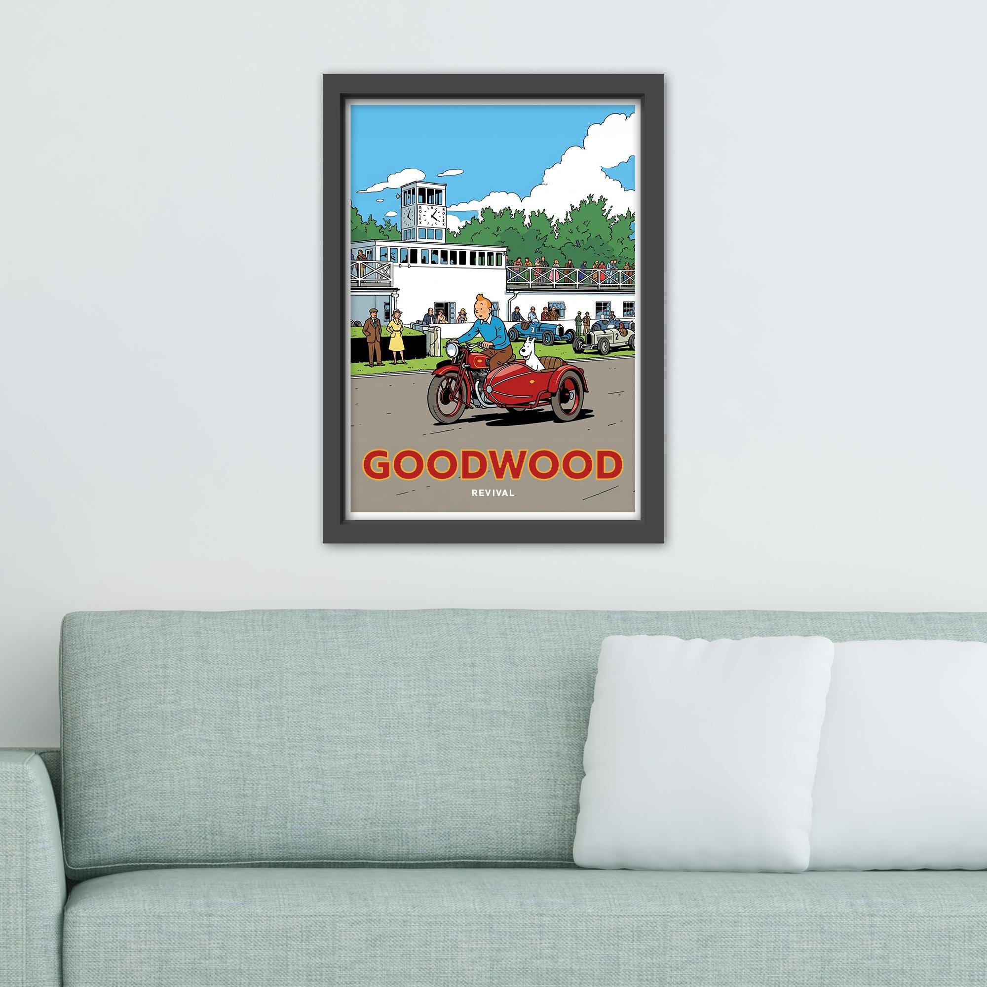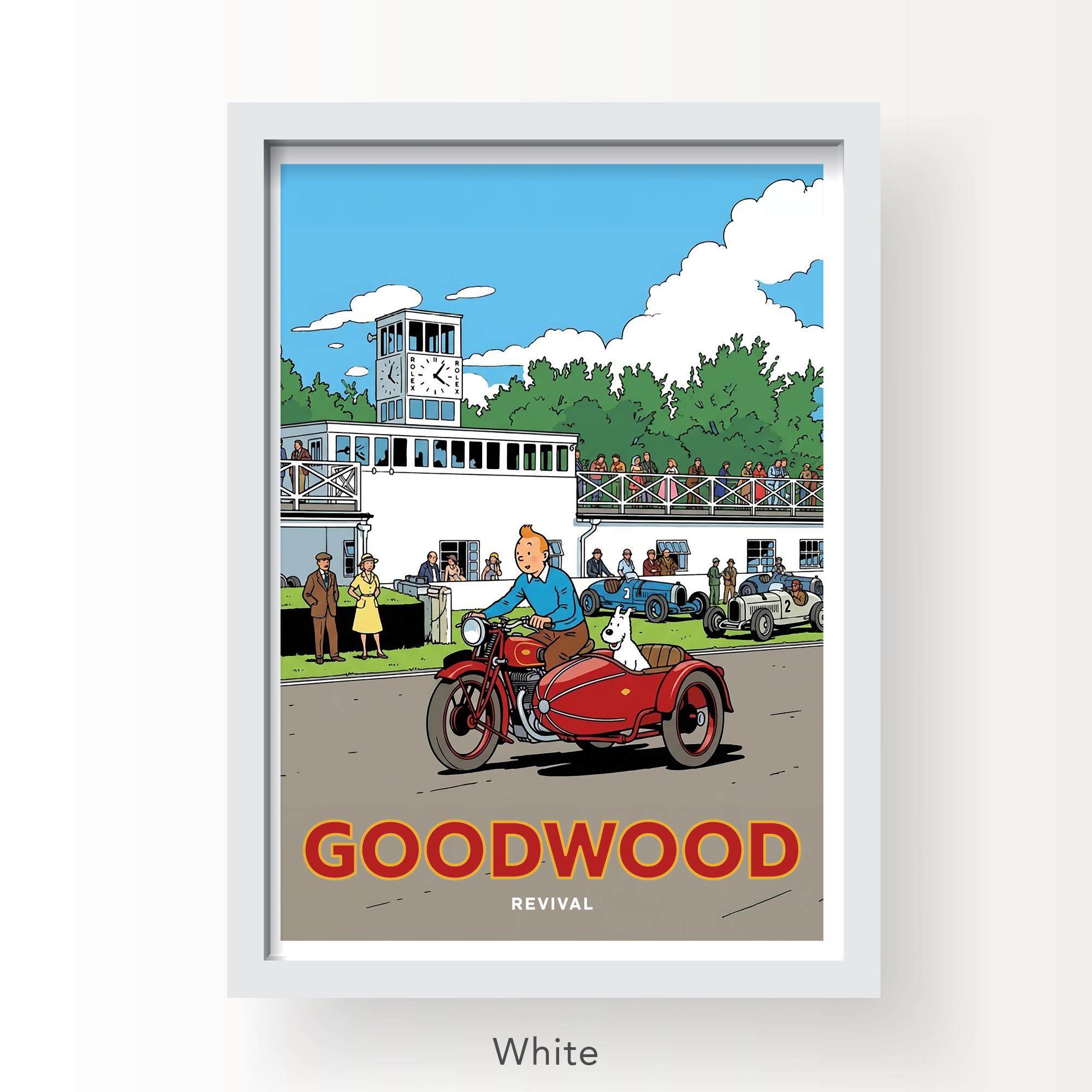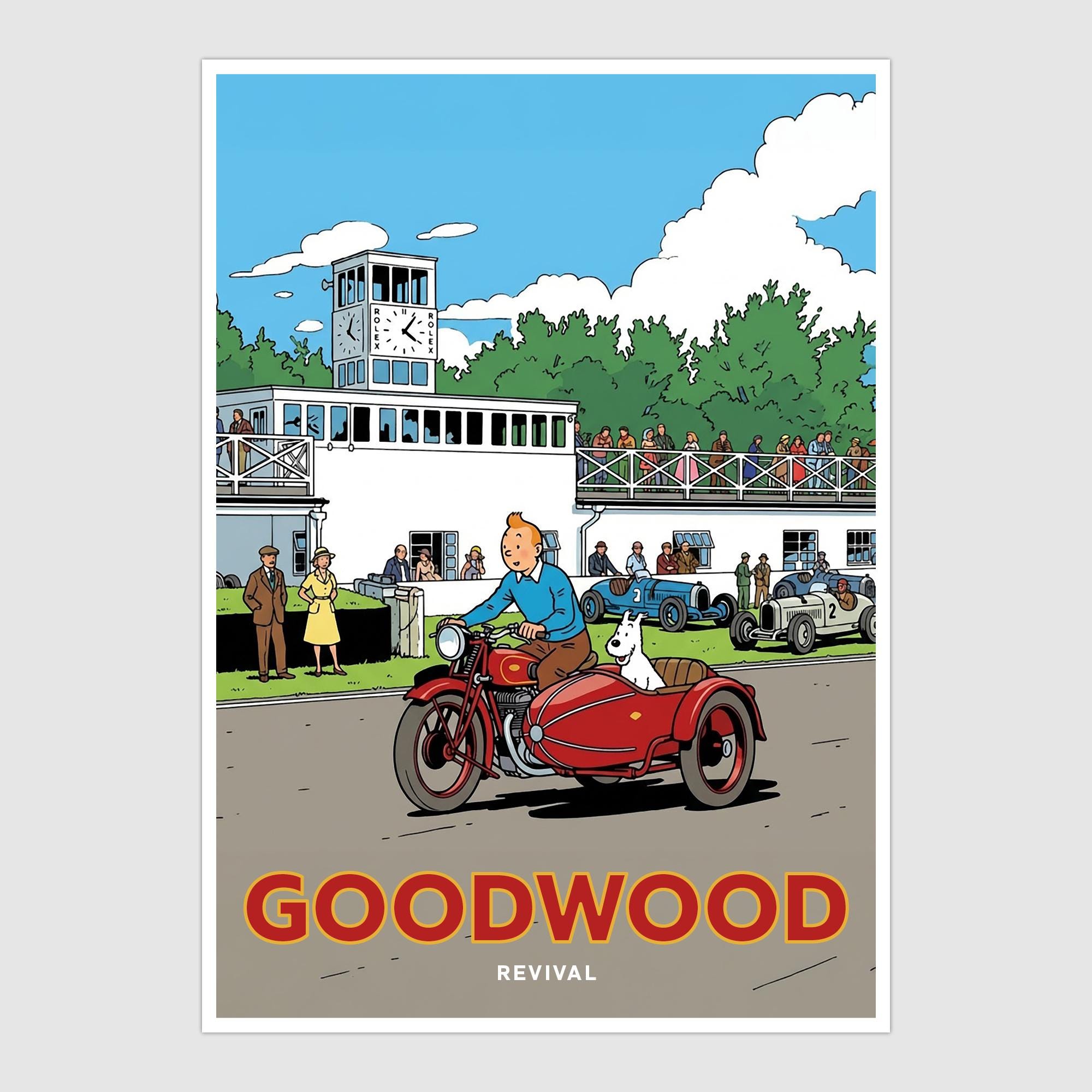 A poster-style illustration of the Goodwood Revival with emphasis on TinTin.